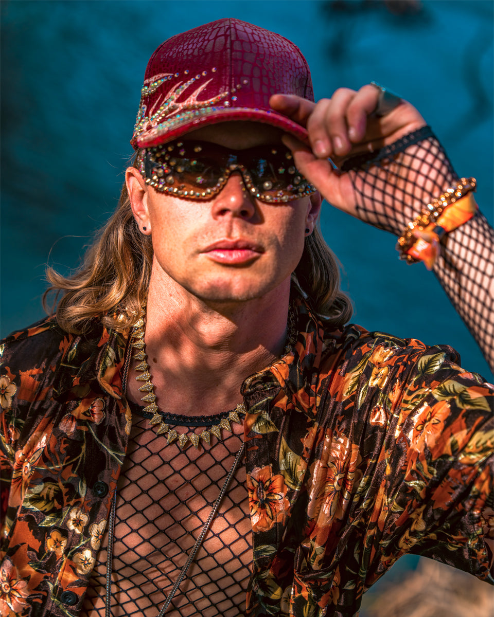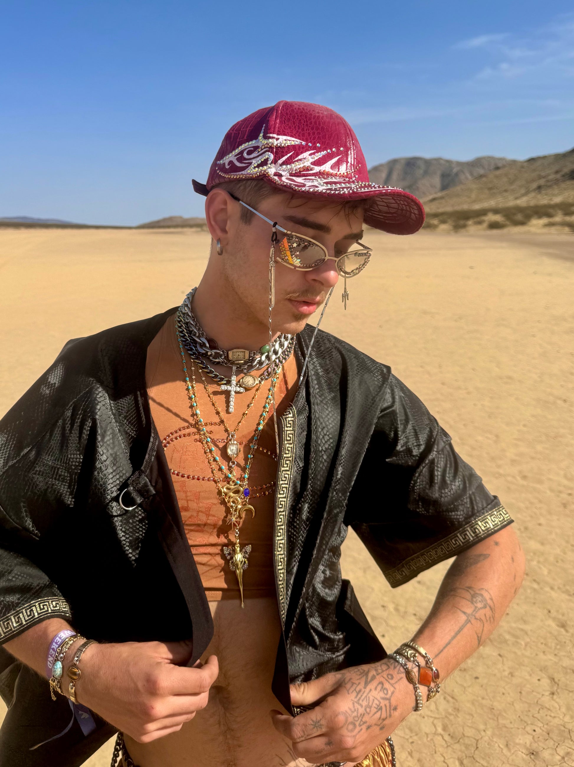Description: This one-of-a-kind red snake print hat is hand-painted with white screen printing ink on one side, then adorned with swarovski crystals. Perfect for your next festival or everyday streetwear. Handmade in California and ready to ship!