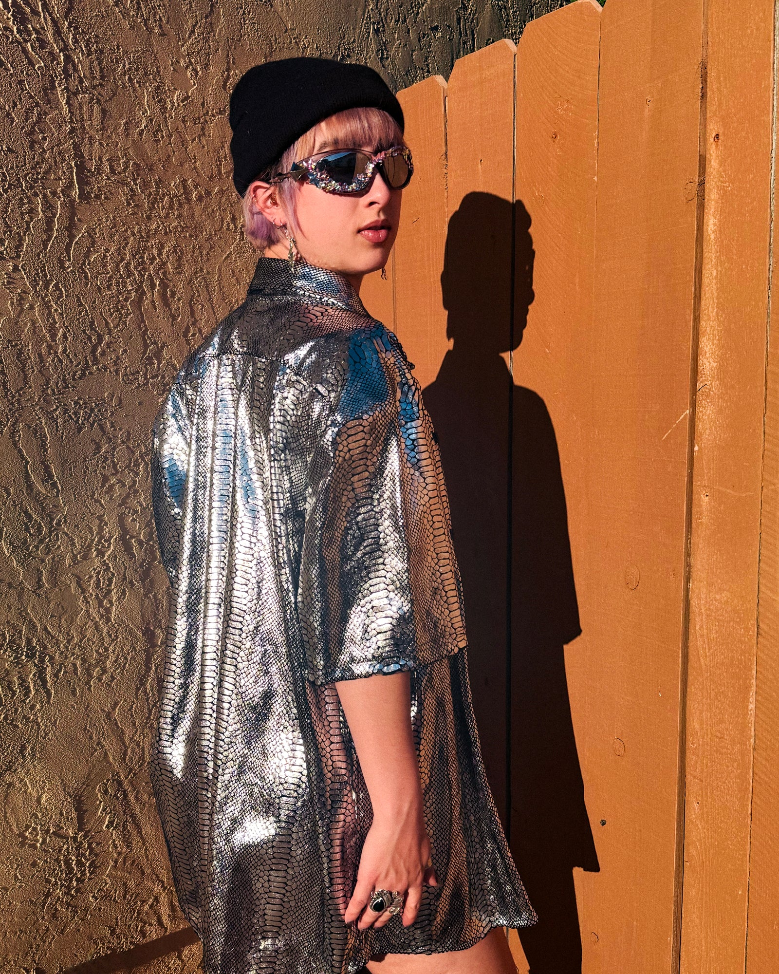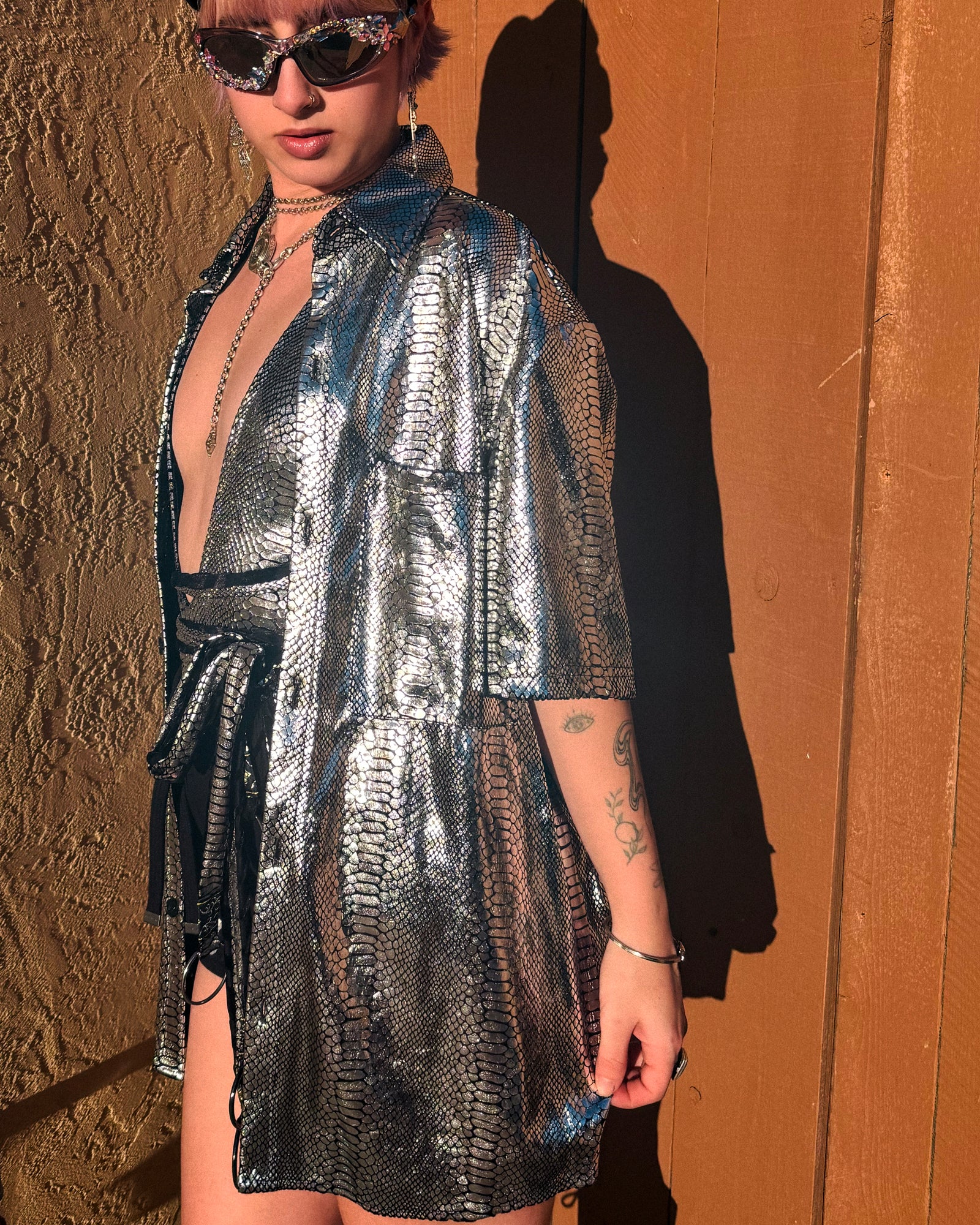 Description: This men's button down (or women's dress) is velvet printed with a silver metallic snake print. For the men - the curved hem provides a relaxed but high end fit. For my girls - the cured hem in the back is specifically designed to still cover even when you raise your hands above your head! (Yes, even for the long-torso babes out there.) Belted or unbelted, this is the perfect versatile item for any gender, and a garment that any couple could share. It can be your comfy festival fit, your out to dinner look, your afterparty attire, or just your every statement piece.