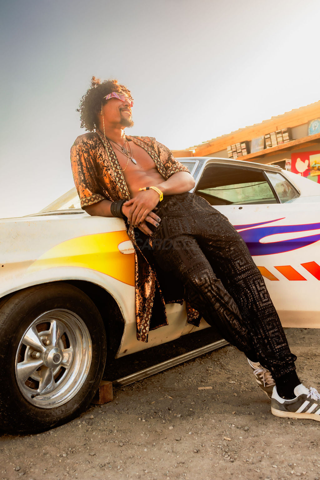 Description: This limited run copper foiled crushed velvet duster is a metallic printed on black velvet base, with geometric orange/black/gold trim! The single velvet layer is perfect for summer or fall outerwear, in our original slim-fitting cut revived from way back to our first production!
