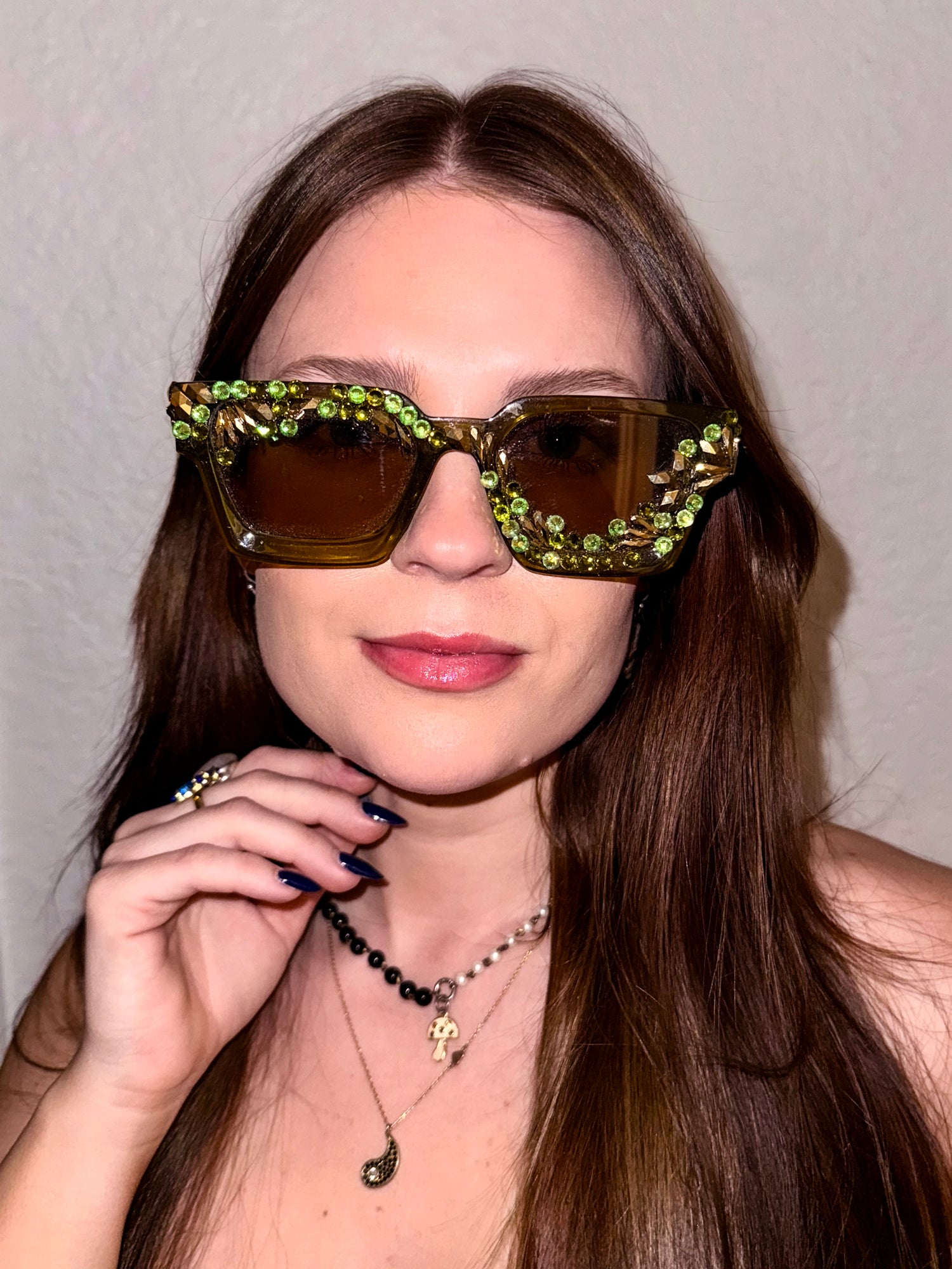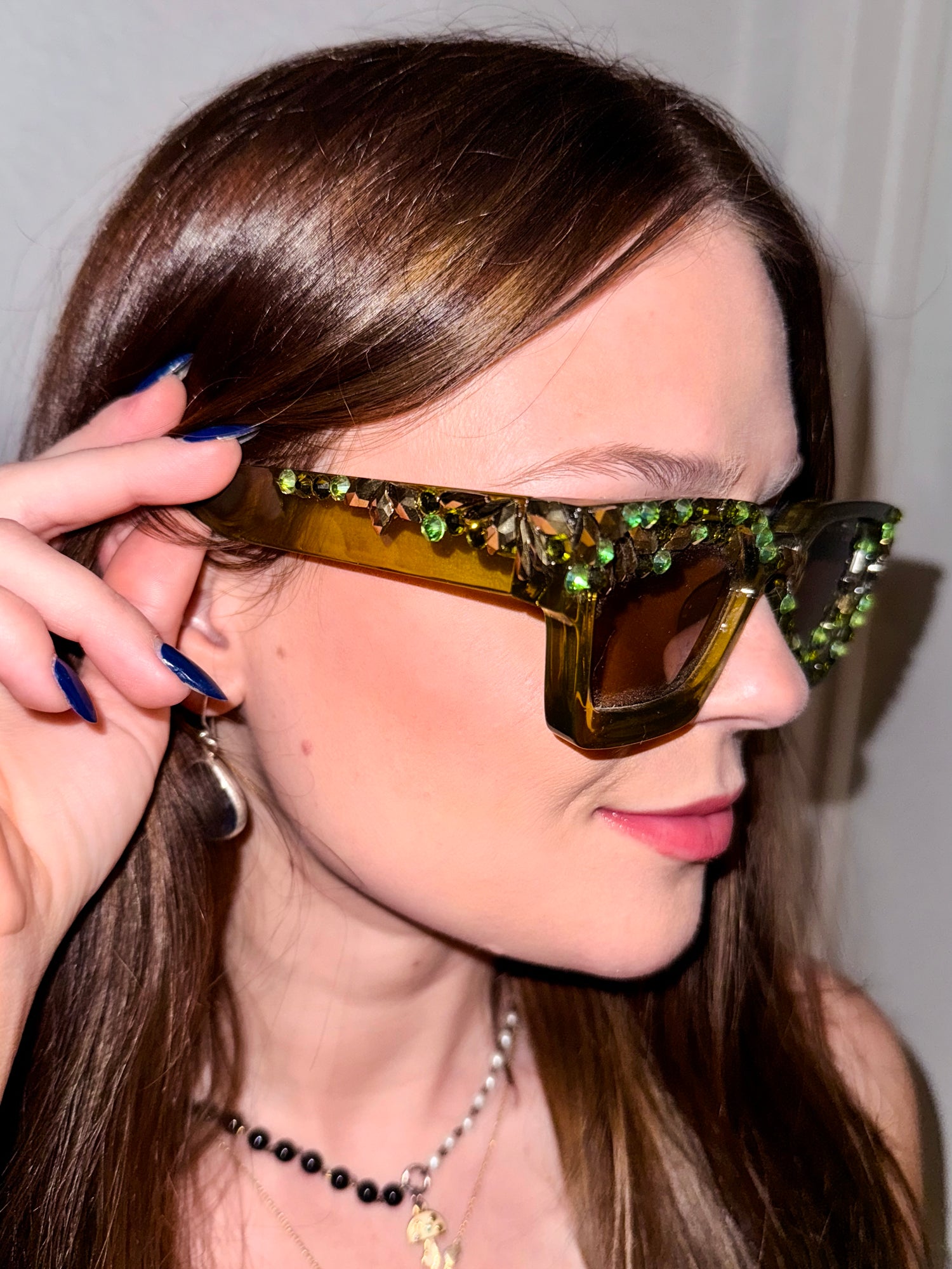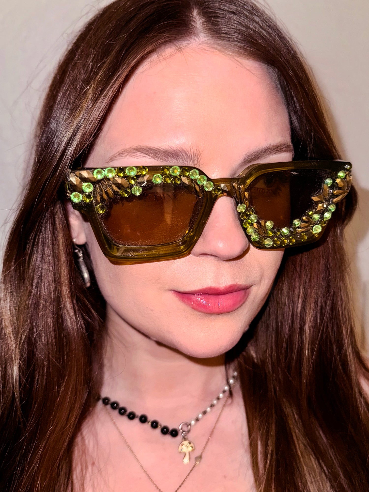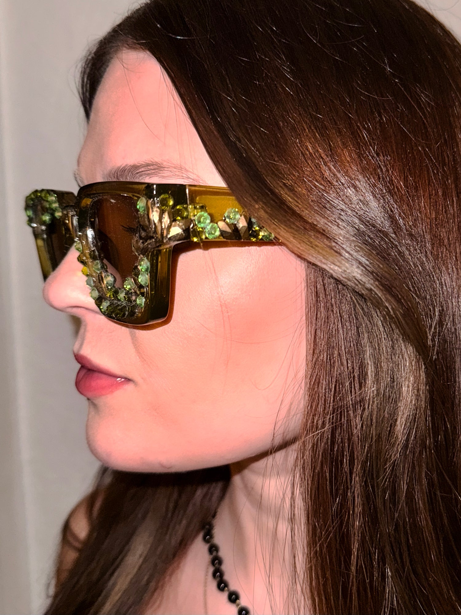 Description: These dark olive green frames are blinged out with iridescent green and gold Swarovski-grade crystals, curving over one lens and under the other. UV-protected, not polarized. Hand-made in California. This style does not come with a chain. Please reach out if you would like to add one.