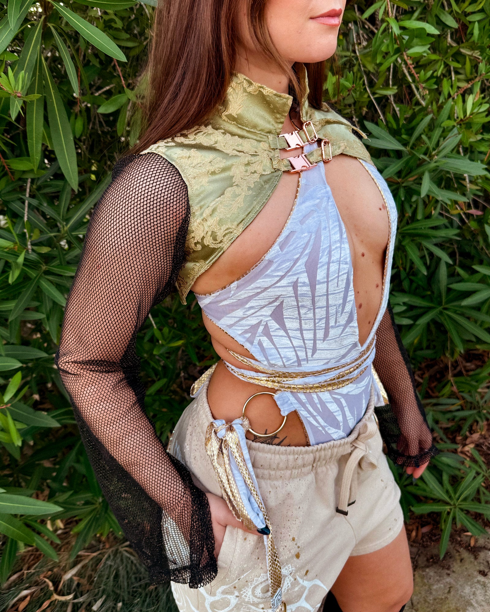 Description: This limited run shrug is made from a black mesh sleeves with gold flecks in the fabric, and a gorgeous light green floral jacquard for the shoulder. It has rose gold buckle closures at the neckline, just below the collar, which can be worn upright or folded down for versatile styling.