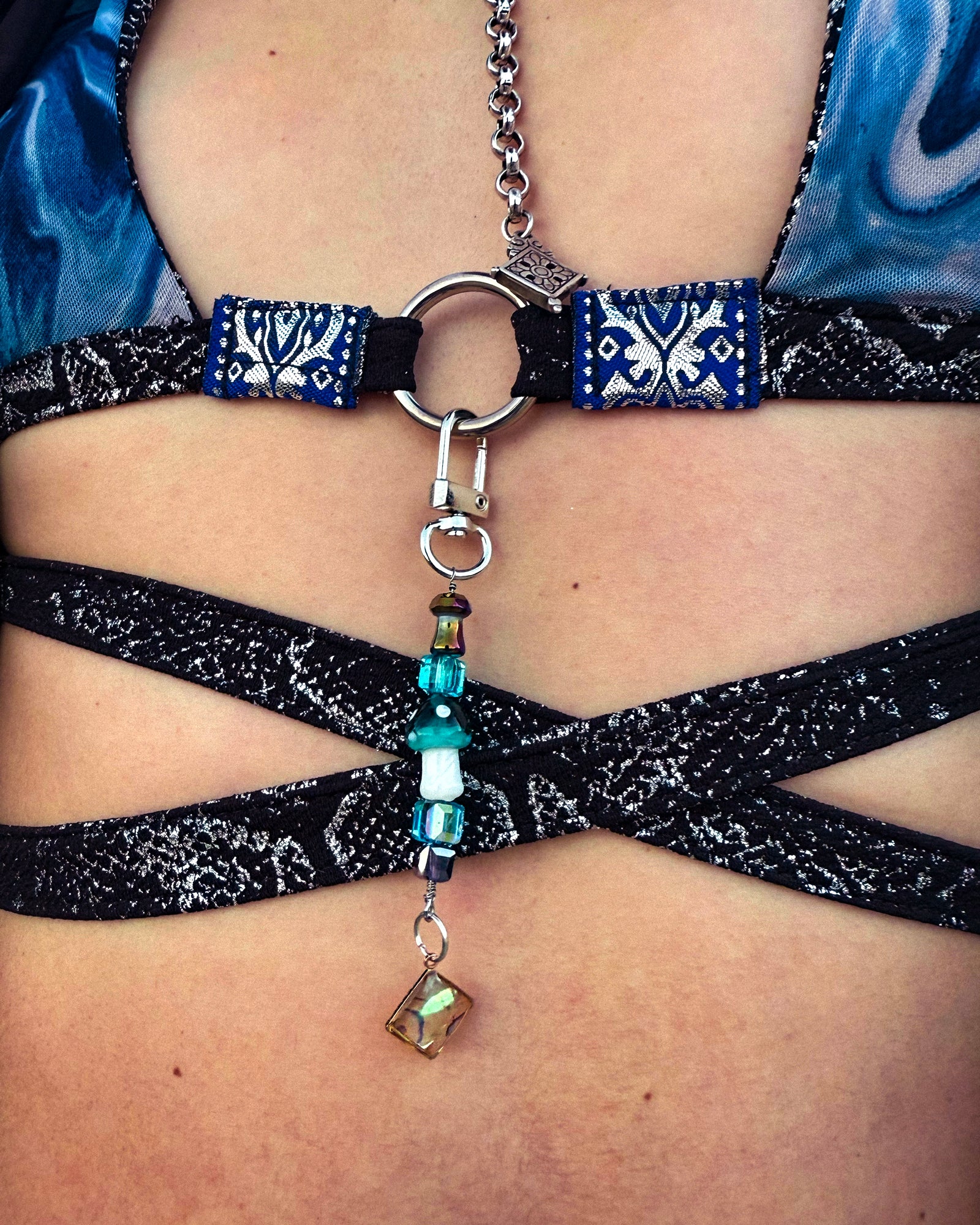 Description: This limited run top is both adjustable and reversible. One side is swirly blue power-mesh, one foiled snake print. Simply clip the clasps anywhere along the thick and sturdy chain to adjust the fit of the item. The top is also multi-way, with three different ways to style the chain at the neckline, and two or more options for the under-busy tie. Each top comes with a one-of-a-kind, hand-beaded charm that clips on and off of the ring in the center of the chest for easy cleaning and style versatility. All chains pictured are silver-plated aluminum, and all rings are silver-plated stainless steel. Also available with gold hardware. Can be also be worn as a swimsuit. (Exact trim may vary slightly.)