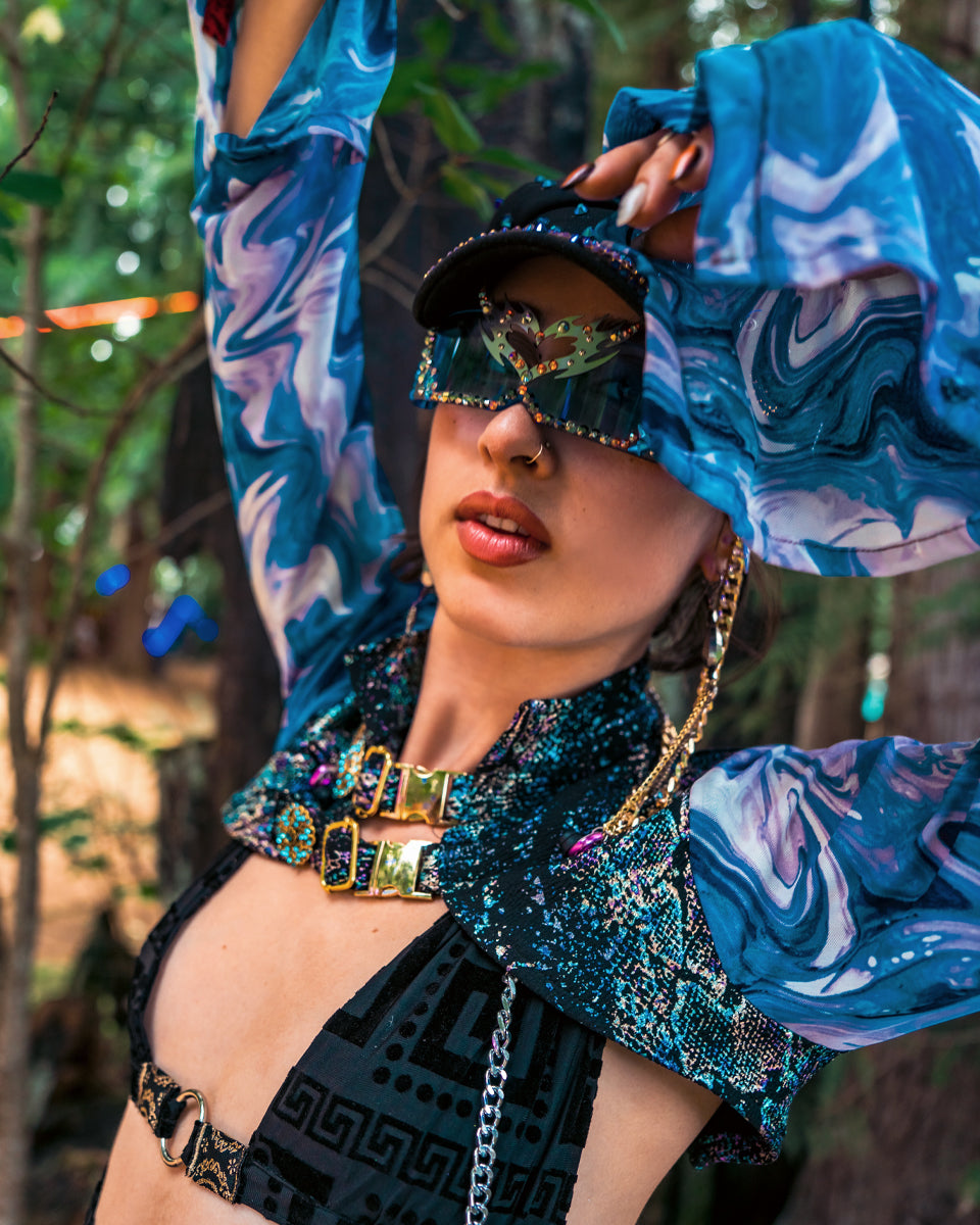 Description: This limited run shrug is made from a black & blue/purple iridescent and metallic snake-print, paired with a blue marbled mesh sleeve. It has buckles at the neck which allow you to adjust to fit your neck and shoulder width. (Buckle metal color may vary - gold, silver, or gunmetal. You may request a specific color in the notes on your order.)